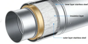 Двухслойные дымовые трубы из нержавеющей стали представляют собой сэндвич-конструкцию: внутренняя труба из жаростойкой нержавейки, слой негорючей теплоизоляции (обычно базальтовая вата) и наружная оболочка из нержавеющей или оцинкованной стали. Такая конструкция исключает образование конденсата и обеспечивает пожарную безопасность. Особенно популярны двухслойные дымовые трубы из нержавеющей стали для жилых зданий – они просты в монтаже и могут проходить внутри помещений без дополнительных защитных коробов.